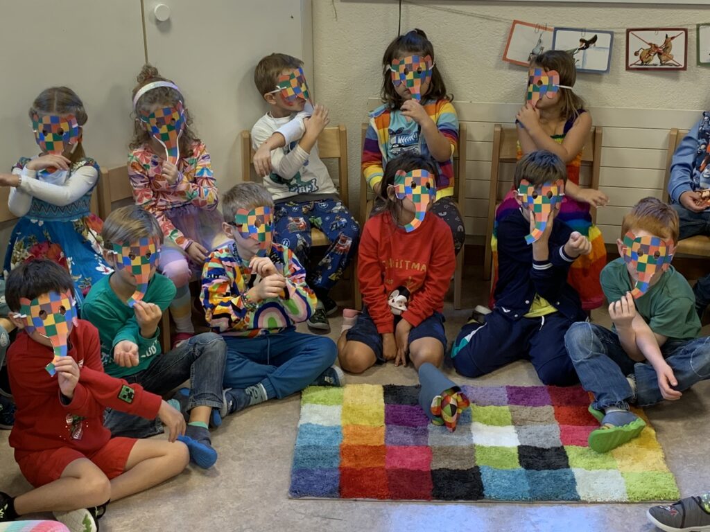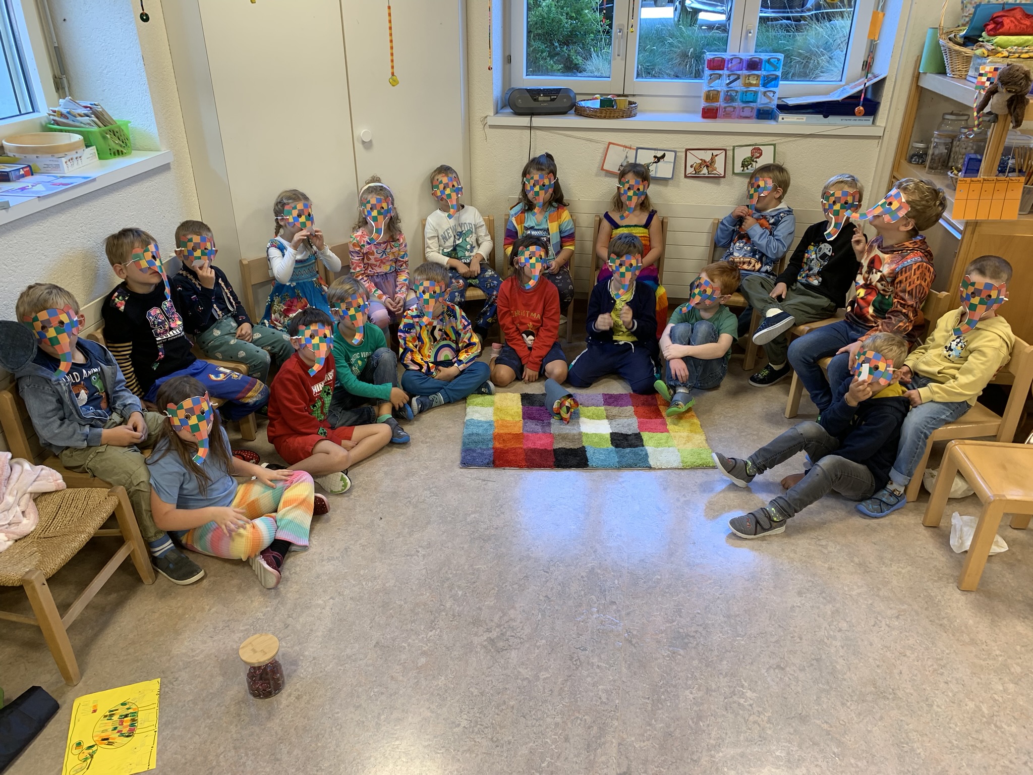 Der Besuch von Maus Möschka zeigte uns auf, wie streng der Winter für Tiere sein kann… Darum trägt sie ihr laaaanges rotes Halstuch. Auf der Stickkarte durfte jedes Kind seine individuelle Möschka gestalten. Dabei lernten wir den Vor- (KG1) und Rückstich (KG2) kennen.