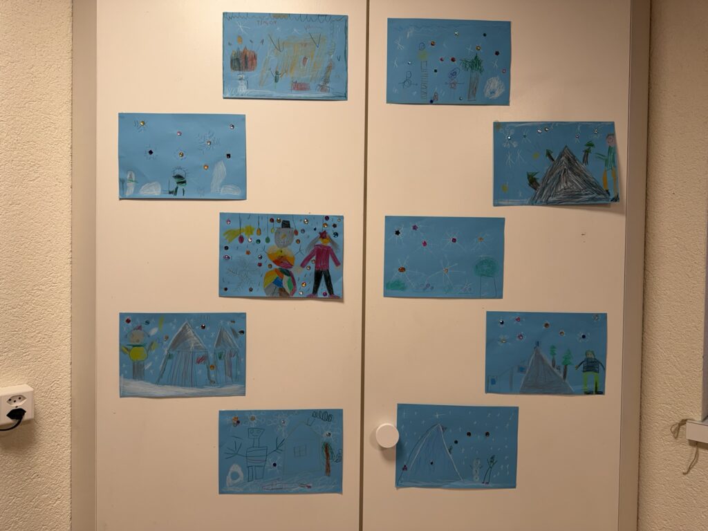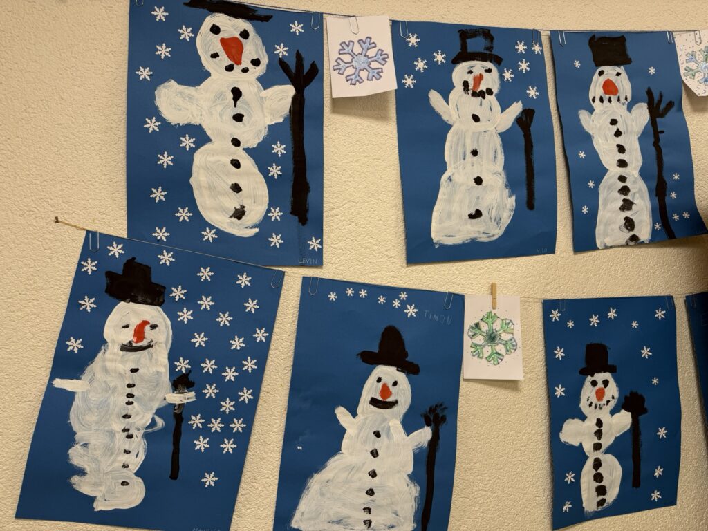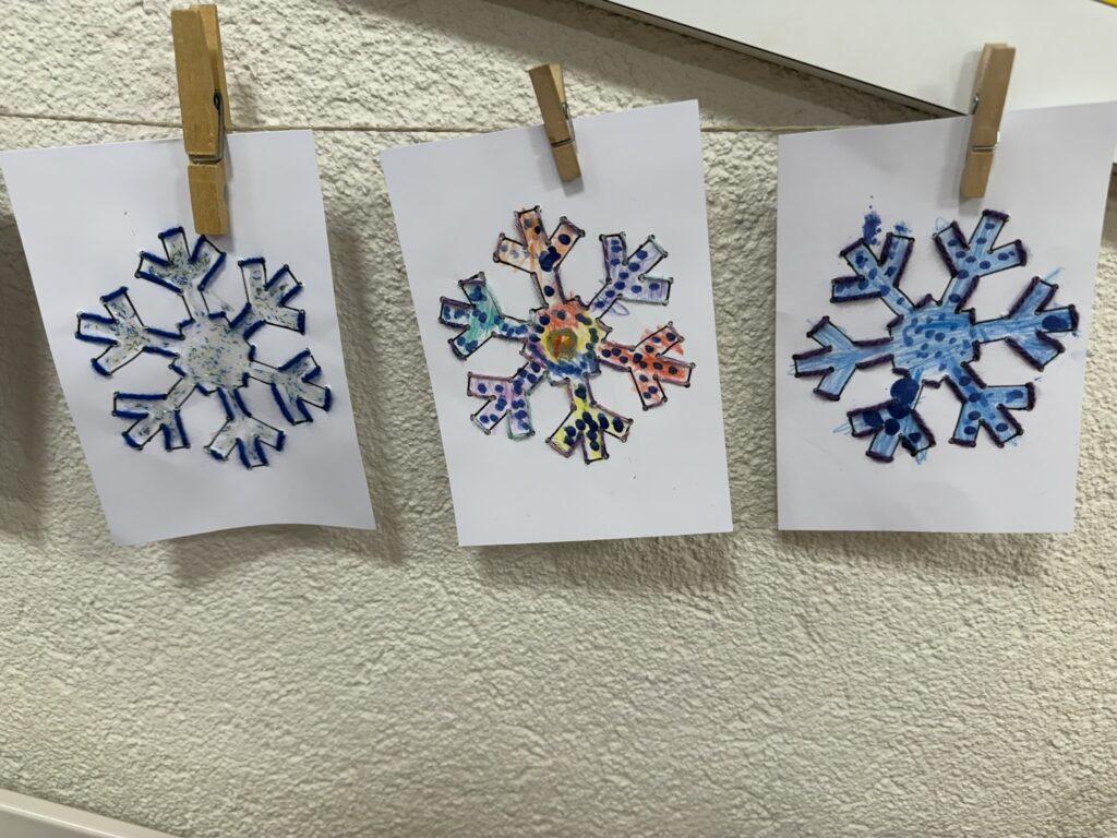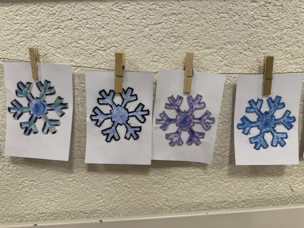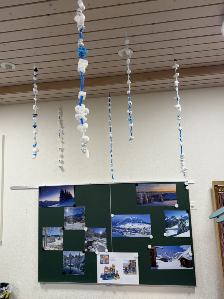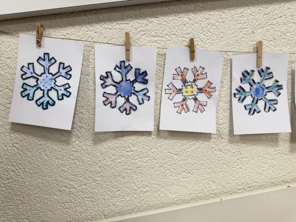In 3er Gruppen mussten die Kinder gemeinsam einen Schneestern legen. Dabei galt es, das Prinzip der Symmetrie in Form und Farbe zu verstehen und umzusetzen. Die Aufgabe erwies sich schwieriger als gedacht und erst beim 2. Themenmorgen entstanden diese Kunstwerke.